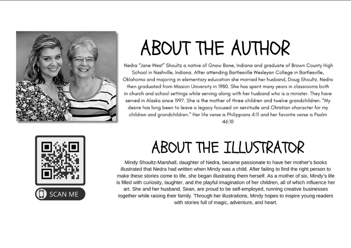 A mother-daughter team. Author, Nedra ‘Jane West’ Shoultz has written and used stories to challenge, encourage, and motivate children for over 30 years. They have been used in classrooms where she taught and also in Sunday School and Children’s Church settings. She has served in the church setting since 1978 in churches where her husband has been the Pastor. They have served in SE Alaska since 1997. Together with her husband, they have three children twelve grandchildren, and many nieces and nephews.